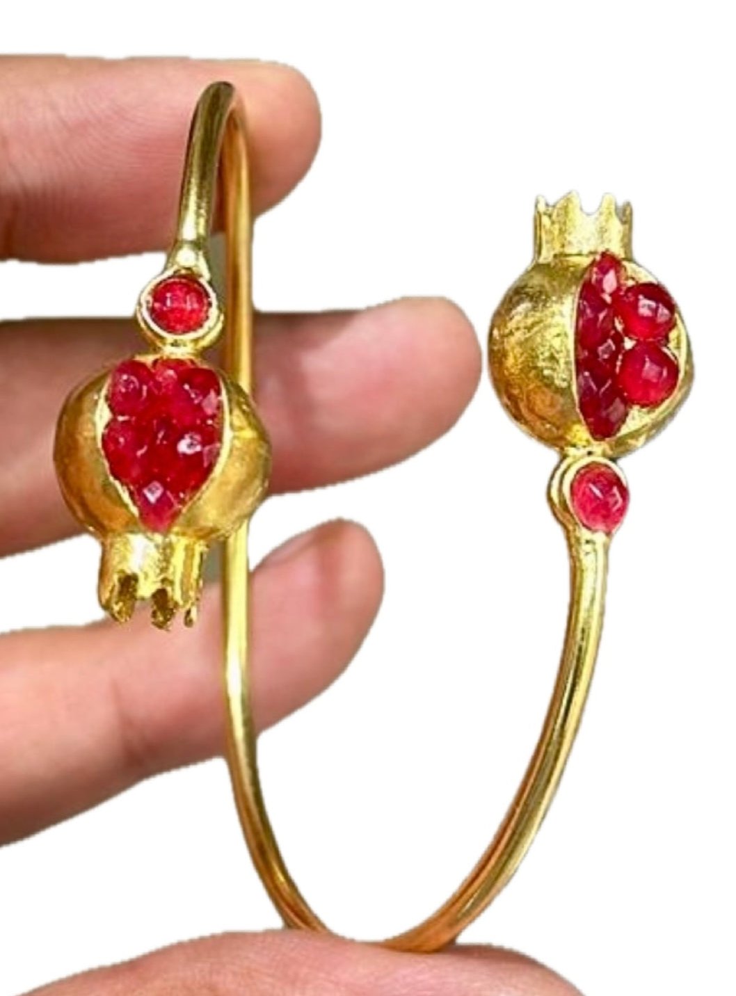 Bonito brazalete de latón chapado en oro y con terminaciones en forma de fruta de la granada, adornada con piedras naturales en tonos rojos.